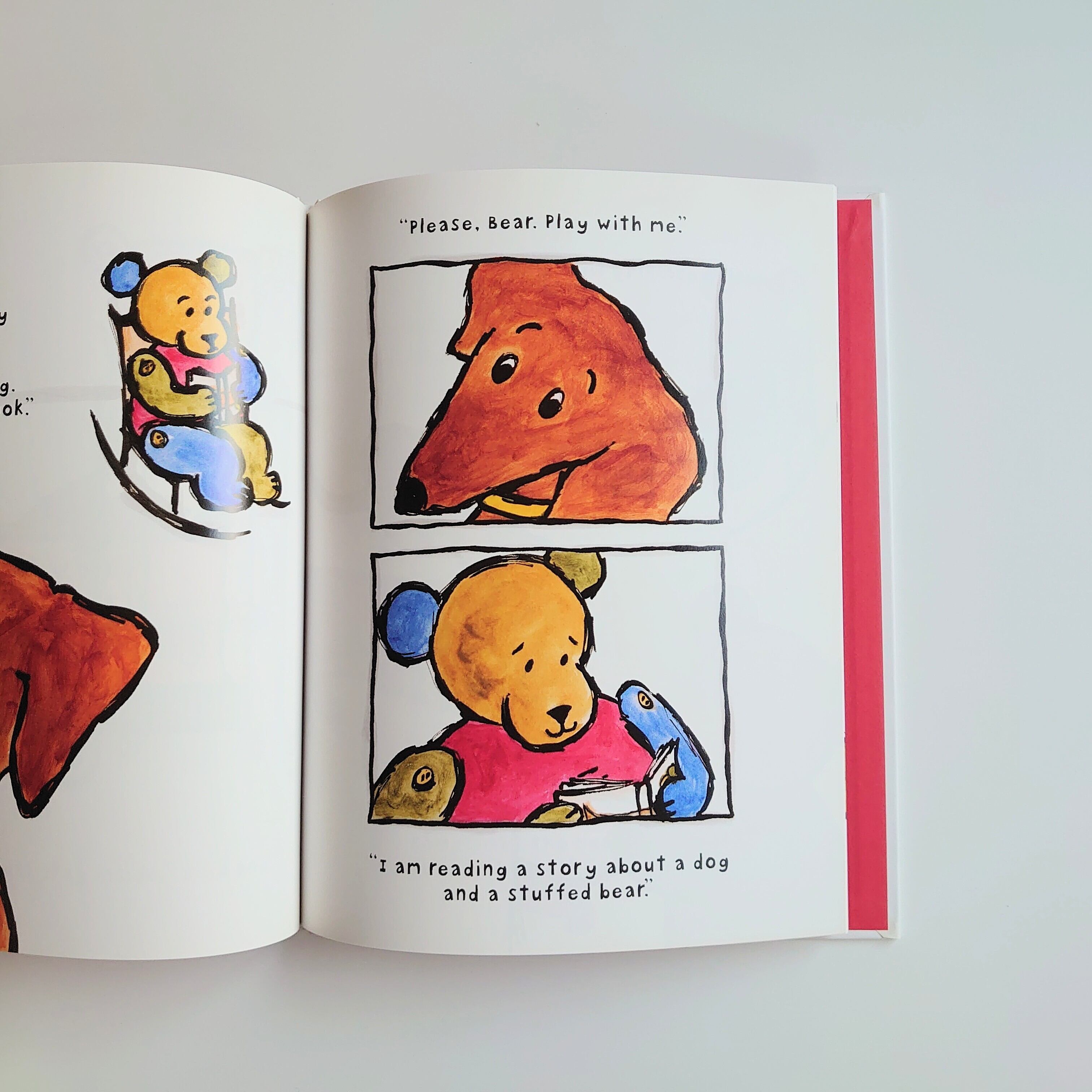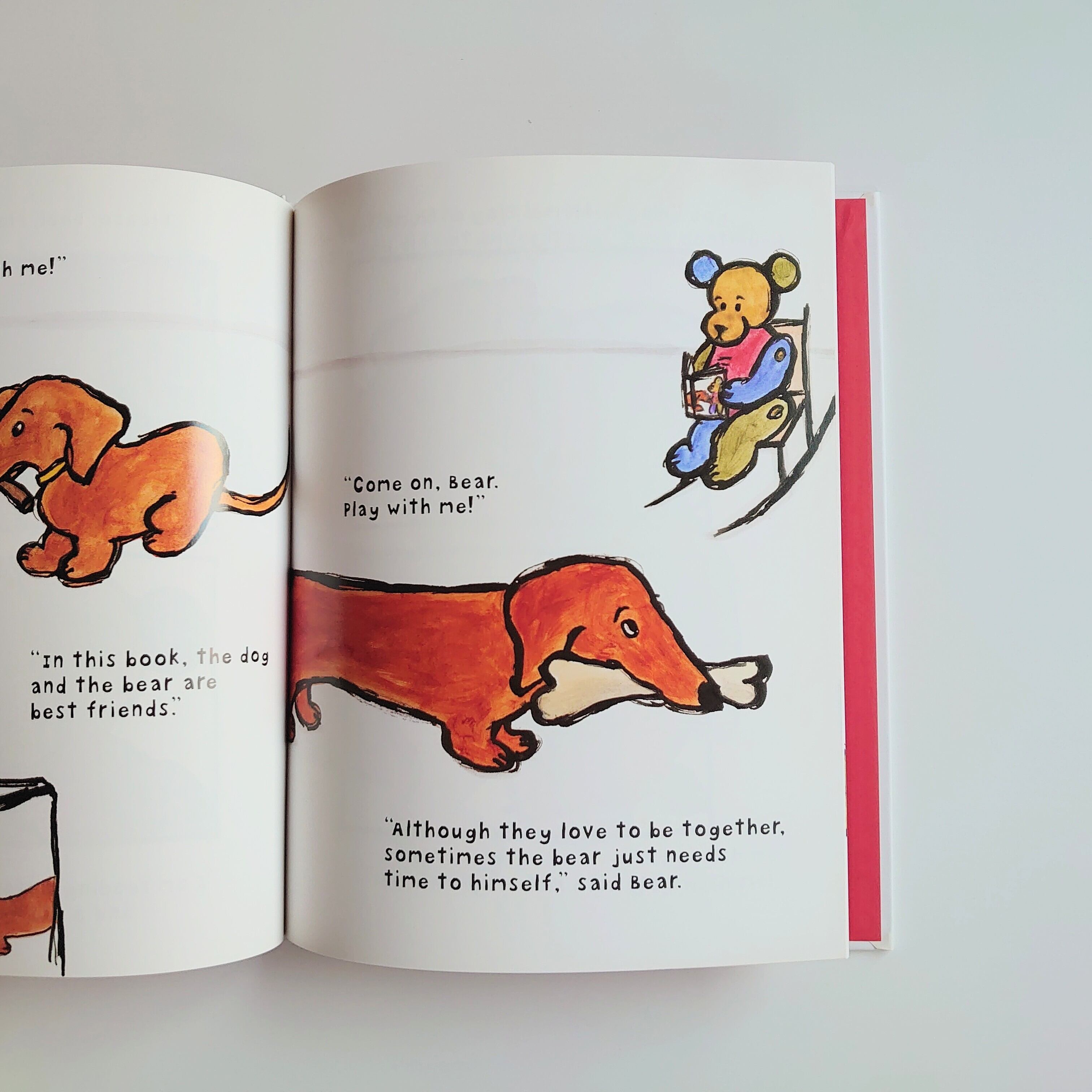 「ねえ、あそぼ!」と、いぬが誘いますが、くまは読書中。それでもめげないいぬに、くまも降参。