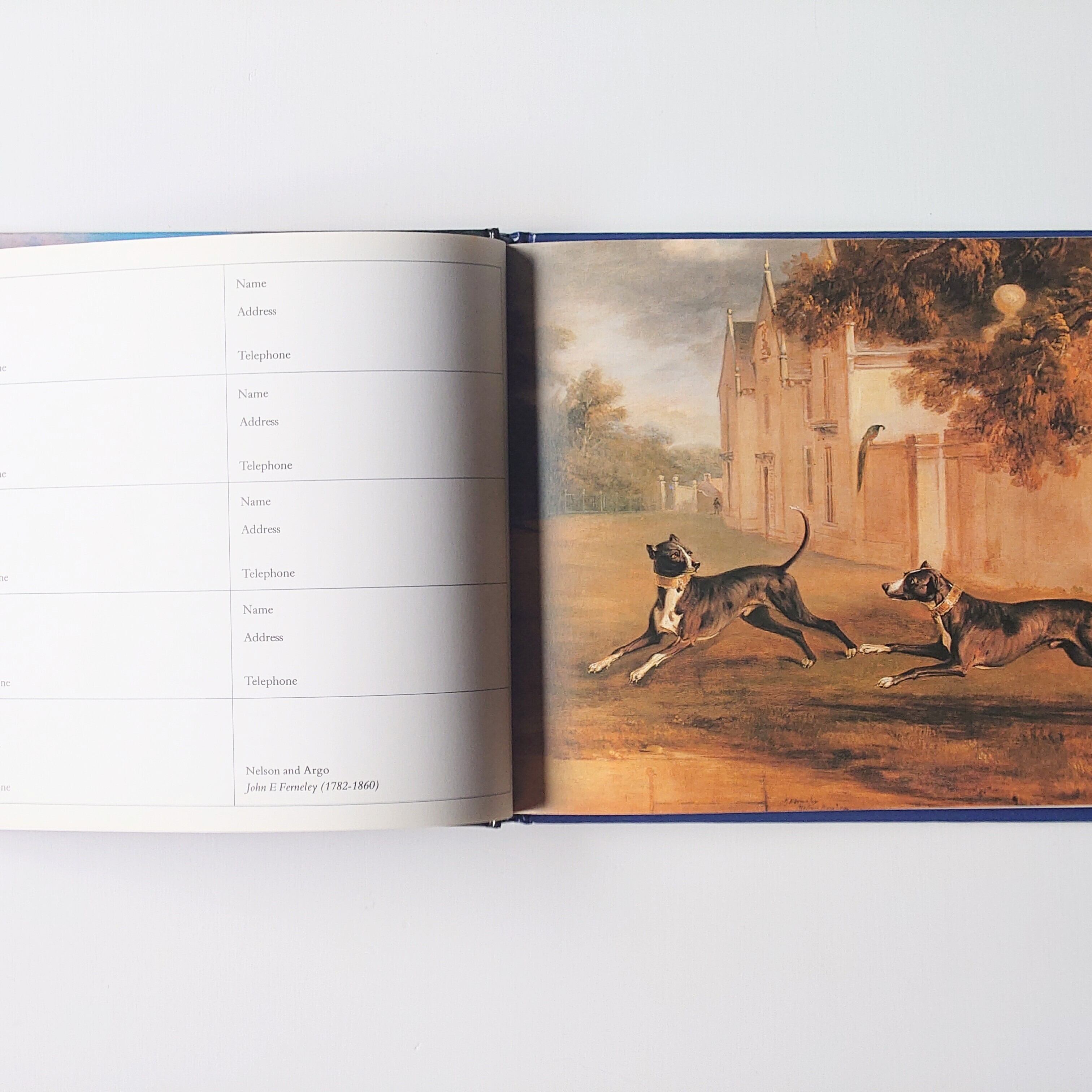 海外のアドレス帳。犬のアート画が挿絵として掲載されています。